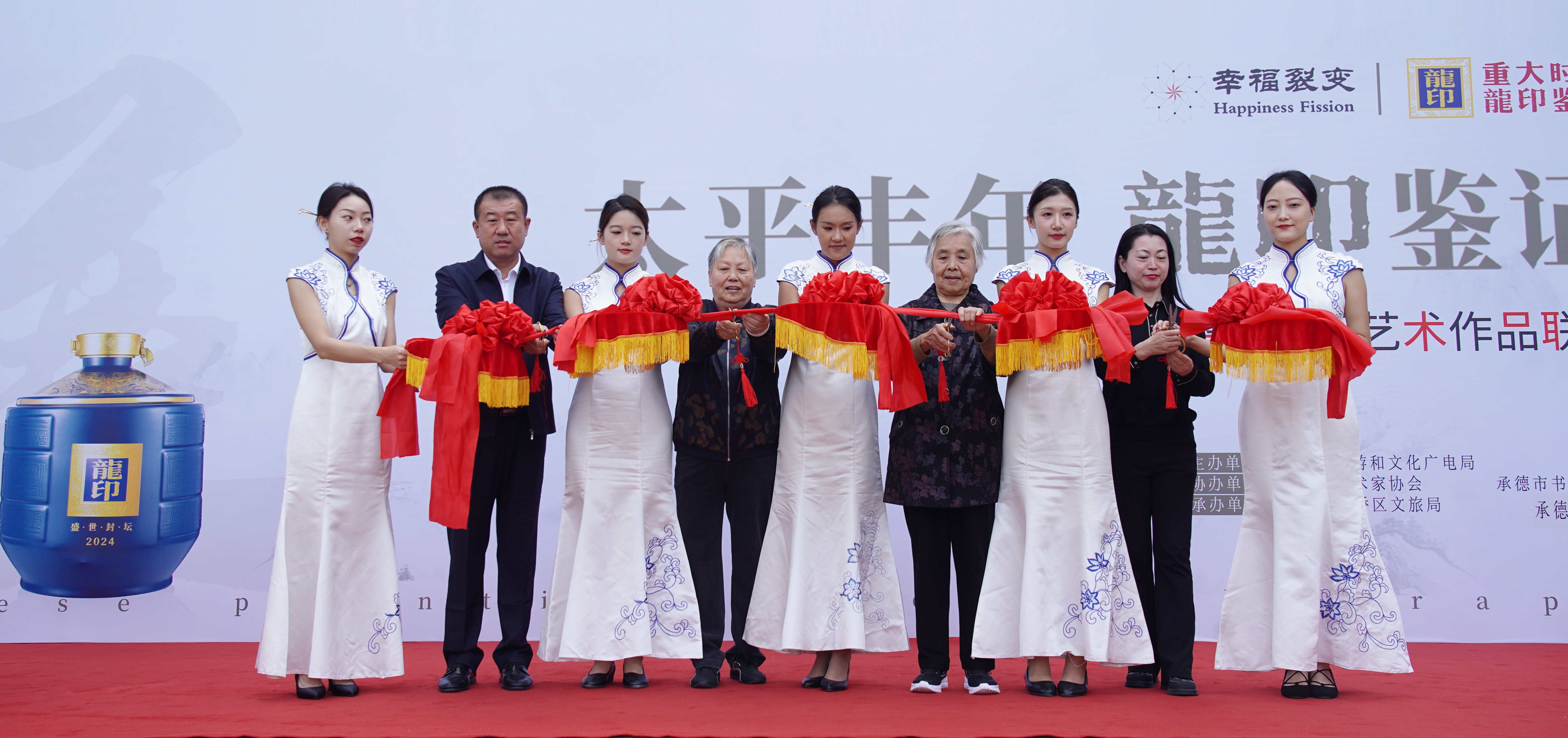 太平豐年,龍印鑒證;9月19日,由承德縣旅游和文化廣電局、板城酒業(yè)主辦;承德市美術(shù)家協(xié)會(huì)、承德市書(shū)法家協(xié)會(huì)協(xié)辦;承德市雙橋區(qū)旅游和文化局、承德縣文化館承辦的“太平豐年龍印鑒證——幸福裂變書(shū)畫(huà)藝術(shù)作品聯(lián)展”活動(dòng)盛大開(kāi)幕。