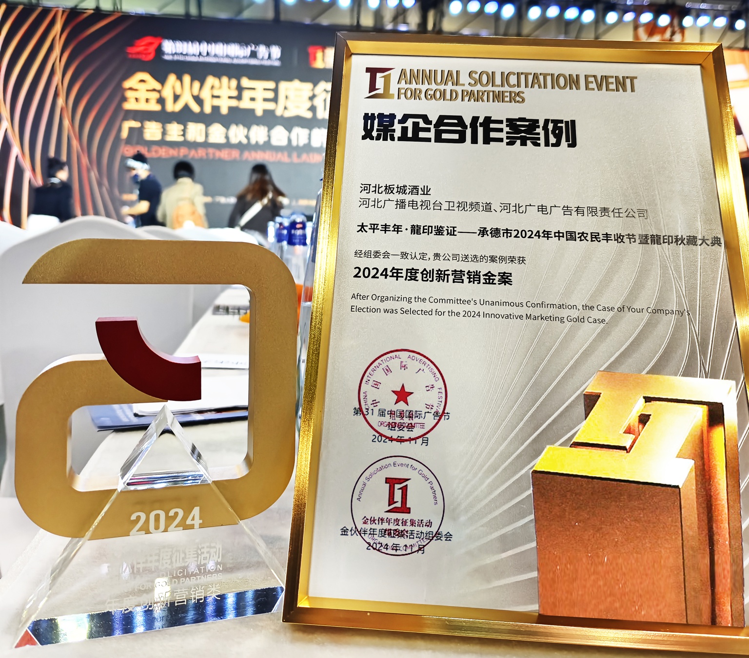 板城酒業(yè)與河北衛(wèi)視頻道合作案例【河北衛(wèi)視聯(lián)合廣電廣告助力板城酒業(yè)農(nóng)民豐收節(jié)暨龍印秋藏大典】入選31屆中國(guó)國(guó)際廣告節(jié)·2024廣告主金伙伴年度征集發(fā)布儀式·媒企合作案例·年度創(chuàng)新營(yíng)銷金案。