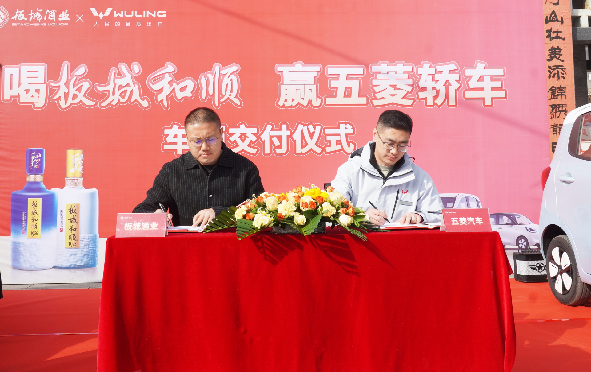 在活動(dòng)現(xiàn)場(chǎng),板城酒業(yè)銷售市場(chǎng)總監(jiān)王曉波與五菱汽車承德駿盛4S店市場(chǎng)總監(jiān)呂呈濤共同簽署了《五菱宏光MINIEV汽車交付協(xié)議》。