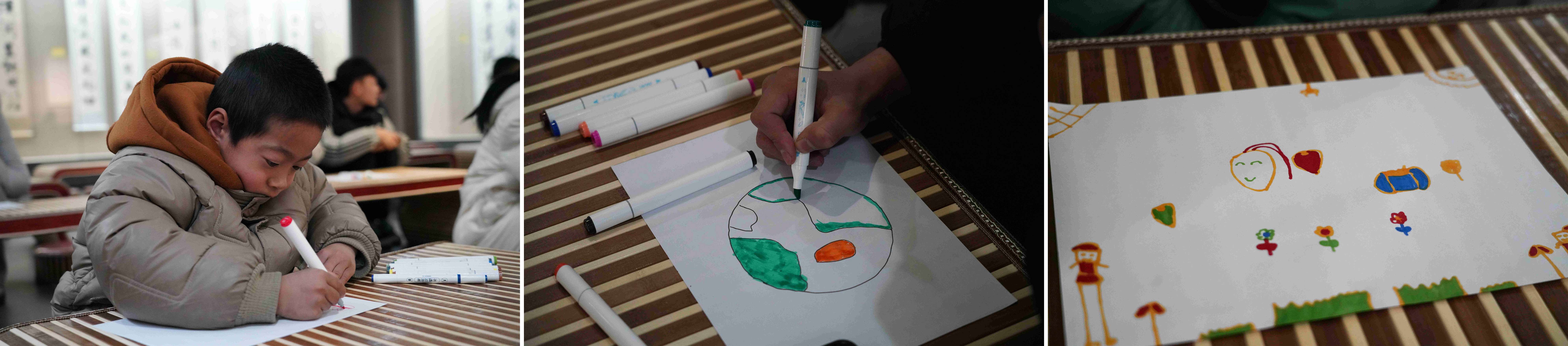 兒童組“我的快樂(lè)星球”藝術(shù)創(chuàng)作:在一個(gè)布置著字畫(huà)與小桌椅的溫馨展廳里,孩子們?cè)趯?zhuān)業(yè)引導(dǎo)下,拿起畫(huà)筆,通過(guò)色彩與線條自由表達(dá)情緒,描繪出各自獨(dú)一無(wú)二的“快樂(lè)星球”。童真的畫(huà)作,成為他們內(nèi)心世界的生動(dòng)寫(xiě)照。